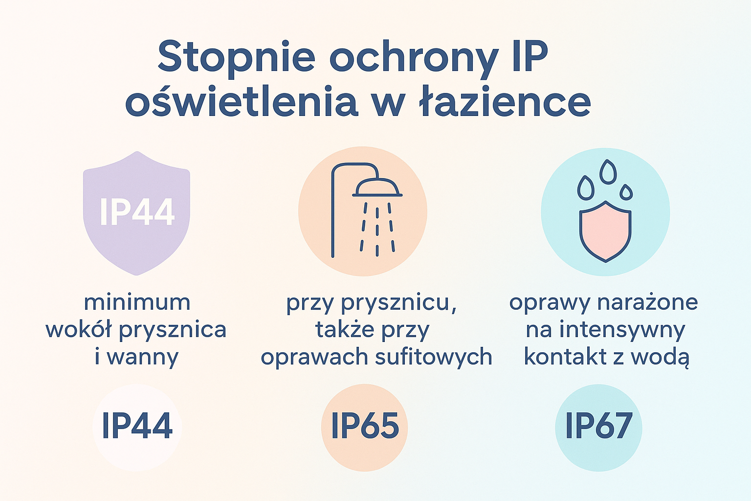 IP44 — minimum przy strefach mokrych (okolice prysznica i wanny). Chroni przed zachlapaniem wodą z różnych kierunków.